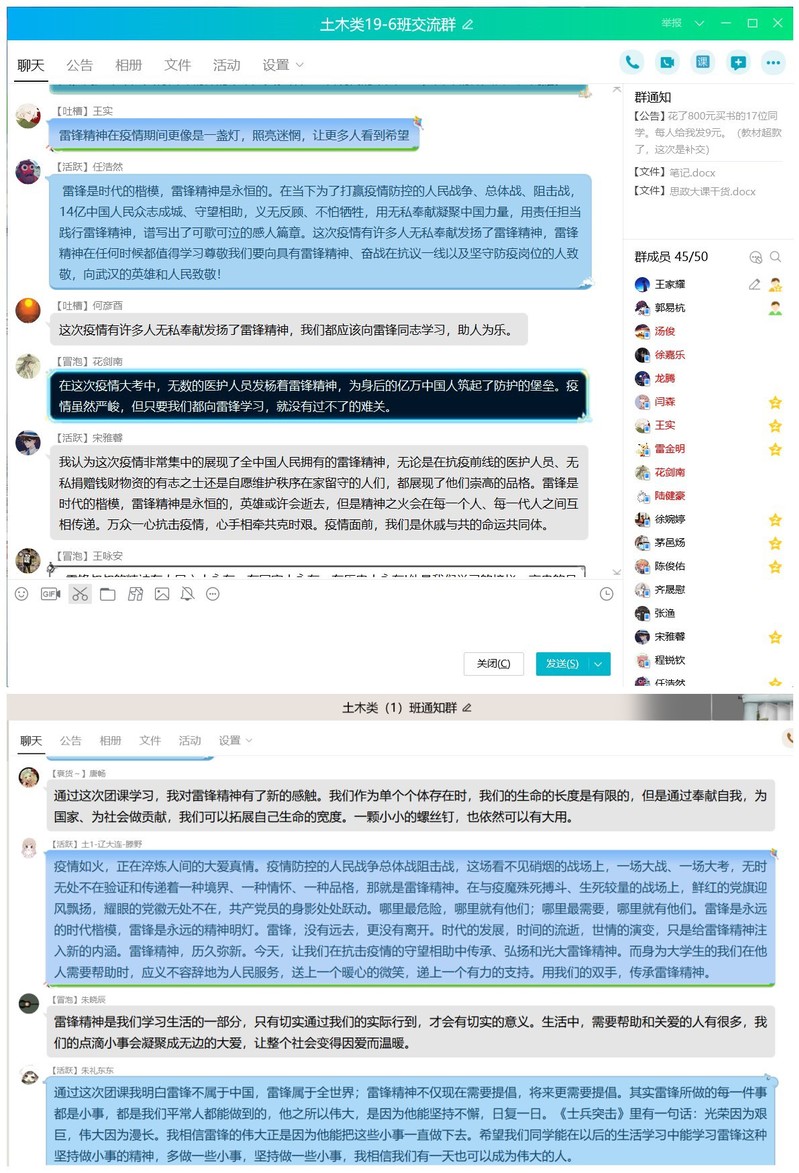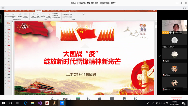 共抗疫情,雷锋精神代代相传。在微团课的最后,各支部青年团员围绕新时代大学生应该如何传承和弘扬雷锋精神进行了积极的讨论。广大团员青年对国家和人民终将战胜此次疫情充满信心,纷纷表示要向身边的活雷锋学习,在新时代用实际行动践行雷锋精神。遵守学校规定,不提前返校,安心居家线上学习,为疫情防控贡献自己的一份绵薄之力。土木类19-1班团支部书记付晓莉说到:“自新冠肺炎疫情发生以来,举国上下齐力同心、各方协同与共、风雨同舟,合力迎难而上,打好疫情防控的全民战、阻击战。无数新时代活雷锋逆行奔赴一线、操守端严、传递温情。作为青年团员,我们要向新时代活雷锋学习,听从号召,积极践行志愿服务精神,热情奉献青春力量,做一个有责任心的中国人,做一个有担当的大学生!”