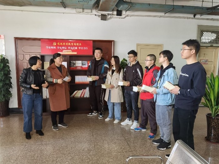 学院党委书记刘梅、党支部指导老师为各支部授书。此外,在学院办公室外设立读书角,添置党史教育类书籍,让主题教育“触手可及”,实现党史教育常态化。刘梅书记指出全体党员要深刻认识学习党史的重大意义,做到“学史明理、学史增信、学史崇德、学史力行”,要坚持理论与实践相结合,确保党史学习教育取得实效。