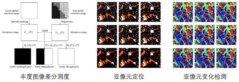 遥感影像变化检测是通过对同一地区在不同时期获取的遥感影像,利用图像处理方法来分析影像信息,最终检测出该地区地表覆盖变化信息的技术。为获得高时空分辨率遥感影像变化信息,基于亚像元定位的遥感影像变化检测技术被广泛研究和应用。为此,研究团队在基于径向基函数亚像元定位方法的基础上,提出一种基于丰度图像差分测度的亚像元变化检测方法。该方法通过构建丰度图像差分测度,建立不同时空分辨率遥感影像间的联系,结合径向基函数亚像元定位方法,从而获取高时空分辨率遥感影像变化信息,同时降低了混合像元分解误差对变化检测结果的影响。通过对Landsat-8与MODIS遥感数据进行实验分析,验证了该方法的有效性。