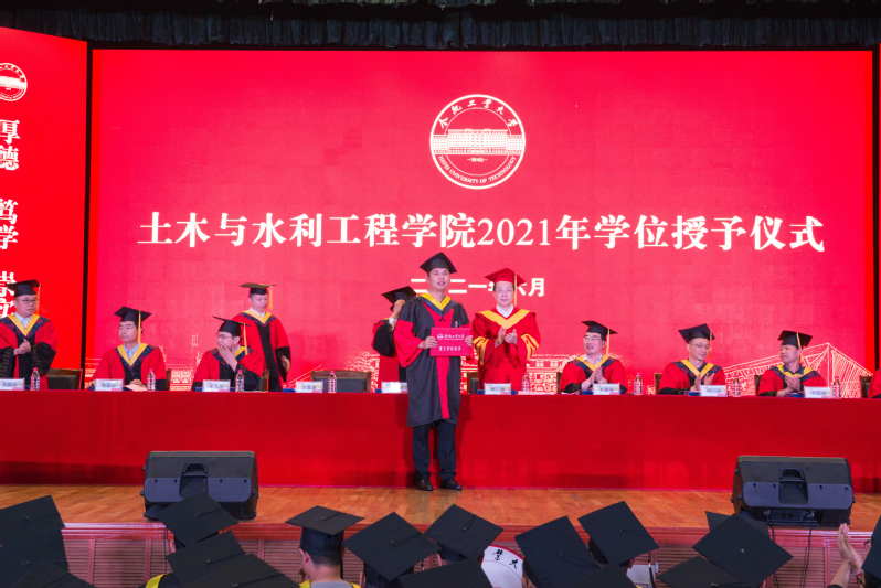 仪式上,学院学位委员会主席、常务副院长王静峰教授宣读《关于授予土木与水利工程工程学院2021年毕业生学位的决定》,授予王志龙等518名本科生工学学士学位,授予李金超等3名博士研究生学术博士学位,授予江鹏等100名硕士研究生全日制学术硕士学位,授予汤子祥等126名硕士研究生全日制专业硕士学位,授予王凯军等8名硕士研究生非全日制专业硕士学位。仪式为全体学位获得者颁发学位证书,并扶正流苏。