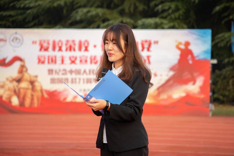 最后,从队伍中走出四名同学,齐声朗诵《谁是最可爱的人》,队伍旁三十余名新生排列出“71”字样的队形,呼应本次纪念中国人民志愿军抗美援朝出国作战71周年主题,整齐划一的队形,慷慨激昂的声音,饱含深情的朗诵,使全场气氛达到高潮。