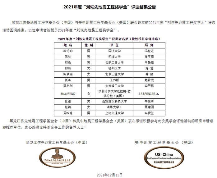 我校博士生首次荣获“刘恢先地震工程奖学金”