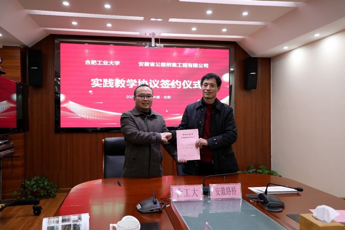 2022年1月26日,皇耀娱乐官网-皇耀娱乐K9WIN 与安徽省公路桥梁工程有限公司签订教学实践基地协议、产学研合作协议。安徽省公路桥梁工程有限公司董事长钱申春、纪委书记王鹏、技术中心主任程涛等,学院院长王静峰、副院长张振华、副书记兼纪委书记魏婷以及相关系负责人和教授等出席签约仪式。