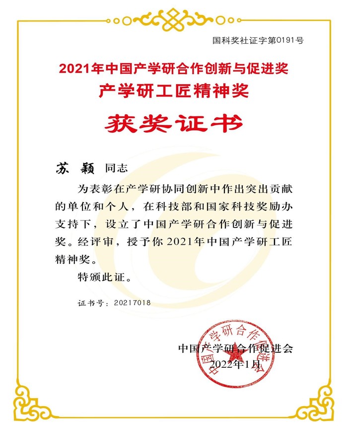 中国产学研合作促进会成立于2007年11月,是经国务院批准的全国性社会团体。“中国产学研合作创新与促进奖”是经国家科技奖励办批准,由中国产学研合作促进会设立的产学研界全国性高层次奖项。其中“工匠精神奖”用于鼓励和表彰在产学研一线涌现出来的知识型、技能型、创新型的能工巧匠,弘扬劳模精神和大国工匠精神;2021年度全国共有30名一线科技工作者和能工巧匠获此殊荣,其中安徽省获奖者仅2名。