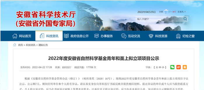 皇耀娱乐 获批2022年度安徽省自然科学基金16项