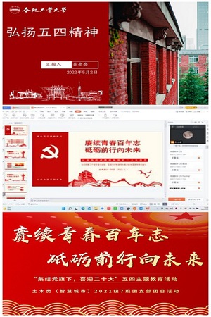精讲主题团课,激励担当作为。学院组织开展“青春心向党,建功新时代”主题微团课评选活动。各团支部书记围绕习近平总书记关于青年工作的重要思想、中国共产主义青年团章程、共青团历史、争做优秀共青团干部、共青团员等内容为支部成员上了一节节生动团课,带领广大青年深入学习相关理论知识,激励广大青年担当作为,展现青春风采。5月1日,土木类智慧城市2021-9班团支部开展的“赓续青春百年志,砥砺前行向未来”主题团课上,团支部书记缪宇博从赓续精神血脉,坚定理想信念,做对党忠诚的实践者等角度带领支部团员回顾无数革命先烈、仁人志士面对敌人的恐吓利诱,对党忠诚、矢志不渝的革命历史,号召大家传承红色基因,坚守为民情怀,做一心为民的奉献者。