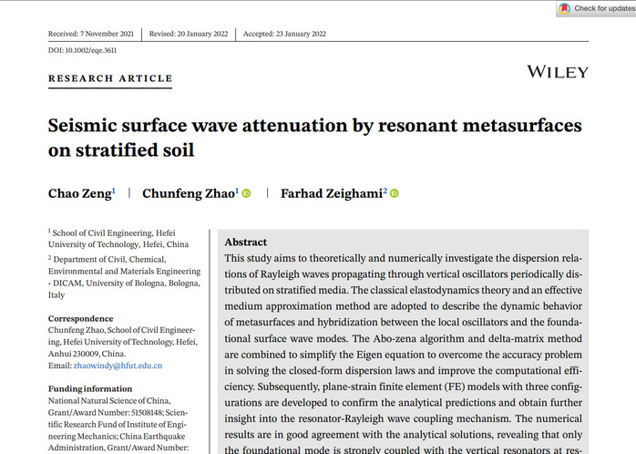 近日,皇耀娱乐官网-皇耀娱乐K9WIN 赵春风副教授在地震超材料衰减地震波研究方面取得新进展,研究成果发表在国际结构动力学TOP期刊《Earthquake Engineering & Structural Dynamics》(JCR Q1,IF=4.43)上,论文题为“Seismic surface wave attenuation by resonant metasurfaces on stratified soil.”,研究生曾超为论文第一作者,赵春风副教授为通讯作者,该项工作得到中国地震局地震工程与工程振动重点实验室重点专项(2020EEEVL0404)和国家自然科学基金(51508148)项目资助。