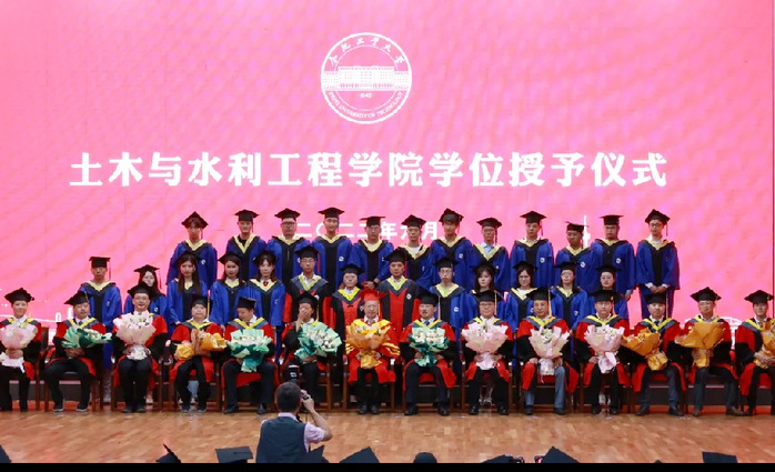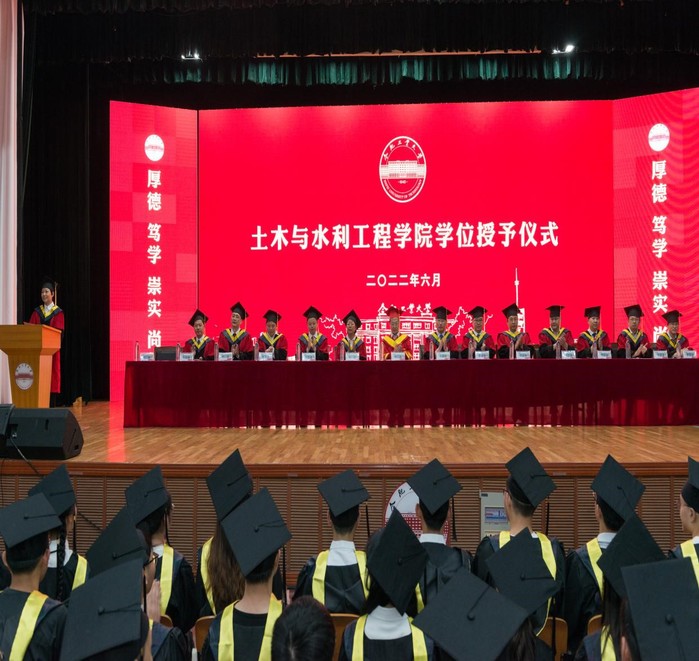 仪式上,参会人员全体起立,齐声高唱国歌,氛围庄严热烈。学院院长王静峰教授宣读《关于授予土木与水利工程工程学院2022届毕业生学位的决定》,授予刘灏天、周历安、张津、夏双庆等682名本科毕业生工学学士学位,授予胡斌等6名同学学术博士学位,授予方晋等100名同学全日制学术硕士学位,授予韦明途等118名同学全日制专业硕士学位,授予熊逸飞等15名同学非全日制专业硕士学位。学院党委书记刘梅老师宣读优秀毕业生表彰决定。随后,授学位老师逐一为全体学位获得者颁发学位证书并扶正流苏。