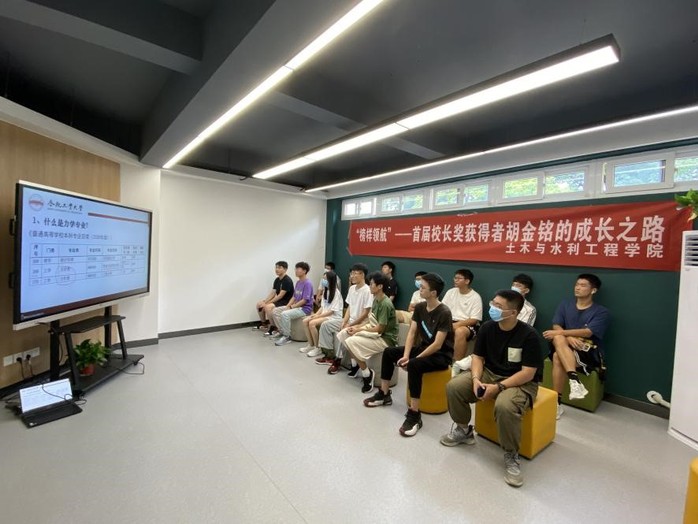 交流会由学生第三党支部原支部书记、首届校长奖获得者、2018级工程力学专业胡金铭主讲。胡金铭首先针对工程力学专业进行了专业分析,旨在帮助正在面临专业分流的2021级学生进行专业认知引导。此外,胡金铭围绕大学目标制定、品质磨炼、能力提升、生涯规划等方面进行了分享交流,他希望学弟学妹们心中有梦有远方、脚下有路有力量,在宝贵的大学时光里以奋斗为底色,不懈追求德才兼备、能力卓越,用实际行动践行“强国有我”的铮铮誓言。