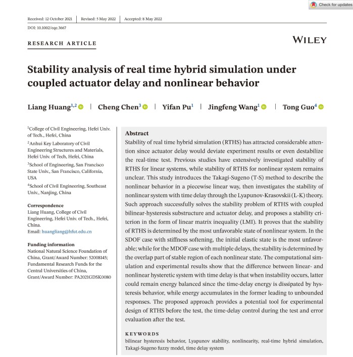 近日,皇耀娱乐官网-皇耀娱乐K9WIN 实验中心副主任黄亮在实时混合模拟试验方法研究取得新进展。研究成果发表在国际结构动力学Top期刊《Earthquake Engineering & Structural Dynamics》(JCR Q1,IF=4.43)上,论文题为“Stability analysis of real time hybrid simulation under coupled actuator delay and nonlinear behavior”。合肥工业大学黄亮为论文第一作者兼通讯作者,硕士研究生卜逸凡和王静峰教授参加,该项工作与美国旧金山州立大学Chen Cheng教授和东南大学郭彤教授联合完成,得到国家自然科学基金(52008145)和土木工程结构与材料安徽省重点实验室自主创新专项(PA2021GDSK0080)项目资助。