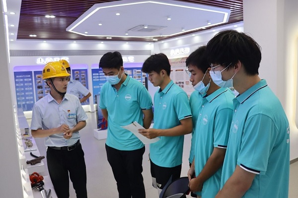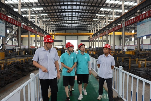 走进生产一线,探索现代建筑业助力乡村振兴路径。18日,团队在县、镇两级团委的大力支持下,先后前往安徽建工北城工业有限公司和安徽建工中仑智能建造有限公司进行学习调研。在安徽建工北城工业有限公司,相关负责人介绍了企业的发展现状、基地优势及主要业务范围,展示了夹心保温外墙板、预制楼板、预制叠合梁等预制构件,技术负责人带领同学们参观了预制构件生产车间,详细介绍了Smart-PC工厂信息系统的应用。在安徽建工中仑智能建造有限公司,团队跟随相关技术负责人的脚步,先后参观了地铁管片加工生产流水线和管片制造信息管理系统智控中心,了解管片混凝土赶平、管片混凝土浇筑、管片钢筋安装和管片入水养护等一系列的生产工艺。