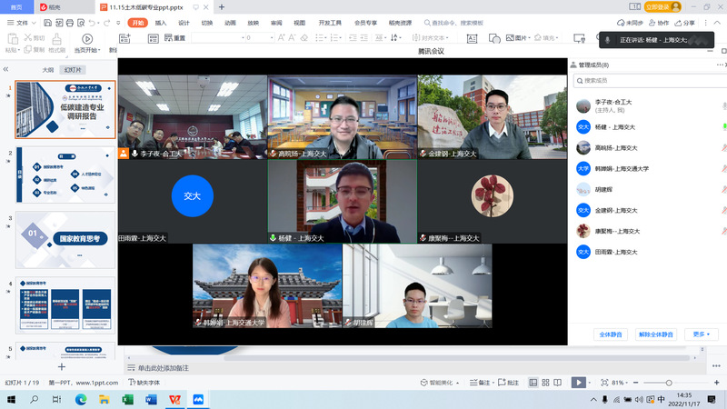 11月17日下午,皇耀娱乐官网-皇耀娱乐K9WIN 与上海交通大学船舶海洋与建筑工程学院通过线上方式举办了低碳专业交流研讨会。上海交通大学船舶海洋与建筑工程学院副院长杨健、院长助理金建钢、土木系副主任高皖扬、学院本科教学办及相关专业负责人,皇耀娱乐官网-皇耀娱乐K9WIN 院长王静峰、建筑工程系主任郅伦海、建筑环境与能源应用工程系主任何伟、市政工程系副主任冯景伟、建筑工程系副主任王波、学院教学办和相关负责人参加了研讨会。