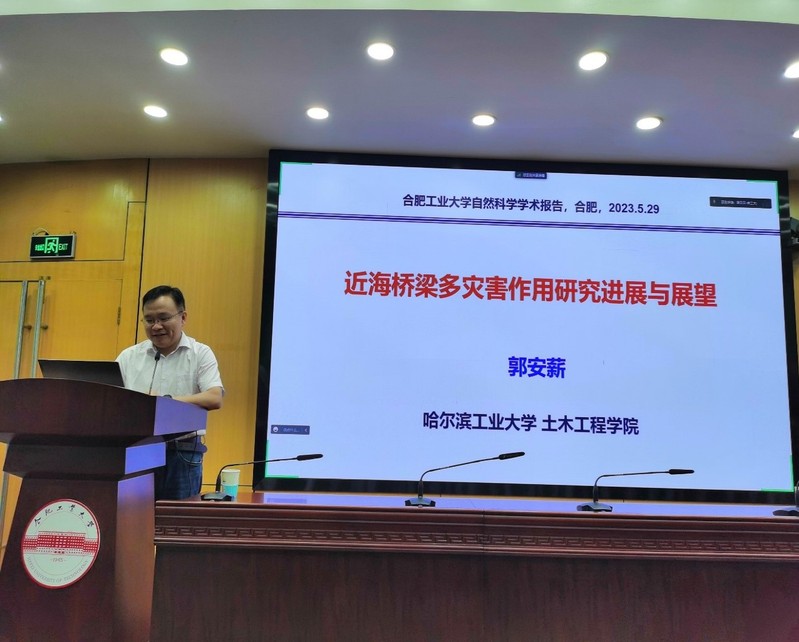 5月29日,郭安薪教授在合肥工业大学屯溪路校区学术会议中心做了学术报告《近海桥梁多灾害作用研究进展及展望》。王静峰院长对郭安薪教授来访指导学科建设并作学术报告表示热烈欢迎,详细介绍了他的学术成就及研究成果,强调了多灾害复杂作用对土木工程结构安全产生巨大挑战,其防灾减灾理论和新技术应用具有的重要科学和工程意义。
