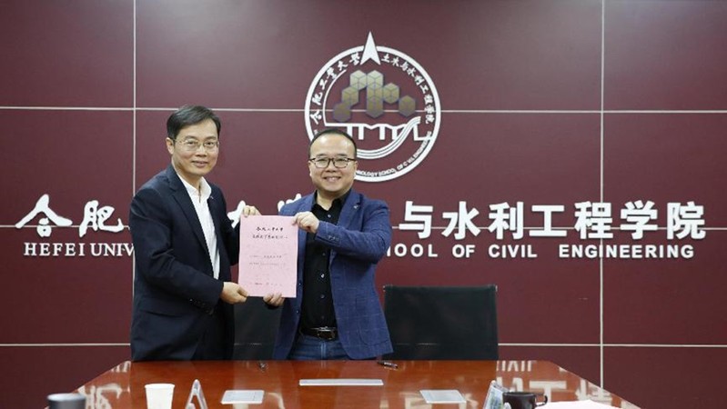 皇耀娱乐官网 党委书记王东坡、副院长张振华、测绘工程系高飞教授及相关教师代表,安徽开源路桥有限责任公司总工程师、副总经理袁斌、党委副书记支晓飞、团委副书记杨修培及公司相关代表,参加了签约授牌仪式。