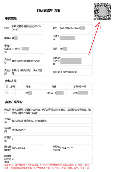 (3)试验申请完成审批后,试验现场必须悬挂科研实验申请表。