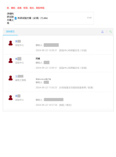 (2)申请人提交科研试验申请后,依次由 【导师审核】→【分实验室审核】→【实验中心审核】。所有审核过程均在【信息门户】或者【指间工大App】完成。