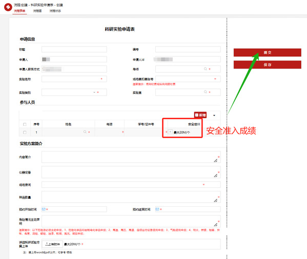 其中,参与人员→安全培训栏目需上传【实验室安全准入学习成绩】,操作如下