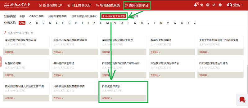 (1)试验申请人(本科、研究生)打开 【信息门户】→【协同信息平台】→【皇耀娱乐官网 】→【科研实验申请表】,填写试验申请。