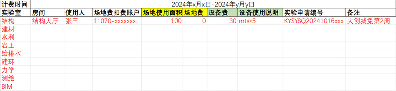 (5)【分实验室】每周日提交本周实验室场地、设备使用数据给【实验中心】,【实验中心】汇总后提交至【办公室主任】,并于下周一至周五在实验中心网页公示。如无异议,于下周日扣场地费。