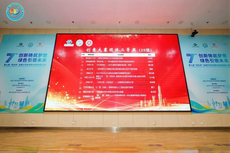 第七届“深水杯”全国大学生给排水科技创新大赛由中国城镇供水排水协会科学技术委员会、全国大学生给排水科技创新大赛组委会指导,深圳市环境水务集团有限公司承办。经过各高校激烈的作品初赛选拨,最终汇聚了来自全国各地86所高校的181支队伍,其中包括127支参与创意赛和54支参与定向专题竞赛的队伍。此次比赛中,郑梦启老师指导的项目“菌藻之交,‘泥’转乾坤—酚氨废水处理及资源化的菌-藻微生物燃料电池”荣获二等奖,距离一等奖仅0.08分微弱差距。