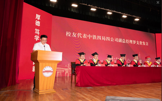 校友代表中铁四局四公司副总经理罗支贵向全体毕业生表示了最热烈的祝贺,向辛勤工作的老师们表达了最崇高的敬意,他勉励学弟学妹们能够风轻云淡地面对成功与失败,在今后的人生之路上不忘初心、树立信心,善于务小、敢于务大,致力于造福他人、造福社会,为母校争光、为祖国添彩。