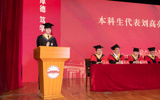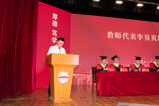 教师代表李贝贝教授为毕业生同学们送上了真挚祝福,他勉励全体毕业生把握机遇,积极进取,脚踏实地,志存高远,把在工大所学知识运用到实际学习生活和工作中,带上母校老师们的殷切期望与祝福,努力成长为德才兼备,能力卓越,自觉服务党和国家的领军人才。