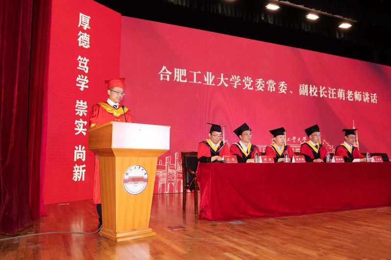 汪萌副校长代表学校向圆满完成学业并顺利获得学位的毕业生们表示热烈的祝贺,向在座的老师、学生家长们表示衷心的感谢。他希望全体毕业生志存高远,脚踏实地,传承工大“工业报国”之志,明确青年担当,胸怀“国之大者”,把自己的小我融入祖国的大我、人民的大我之中,脚踏实地、砥砺前行,让青春在全面建设社会主义现代化强国的火热实践中绽放绚丽之花;热爱祖国,勇担时代重任,听党话,跟党走,心怀忧国忧民之心,爱国爱民之情,在实现中华民族伟大复兴的新征程上迎难而上,挺身而出,担负时代赋予青年的责任,发扬工大精神,争当时代先锋;守住底线,筑牢道德基石,提升道德认知,自觉道德养成,积极道德实践,做好每一件小事,完成每一件工作,做走在时代前列的奋进者、开拓者和奉献者;直面挫折,秉持奋斗精神,勇于面对生活挑战,直面挫折,不断磨砺自身意志品质,敢于斗争,矢志奋斗;心怀感恩,积极回报社会,用感恩的心面对家人、朋友、母校和生活中的点点滴滴,保持积极,汇聚昂扬向上的成长力量。汪萌表示,无论今后身处何方,母校都是同学们人生旅途的温暖驿站和坚强后盾。