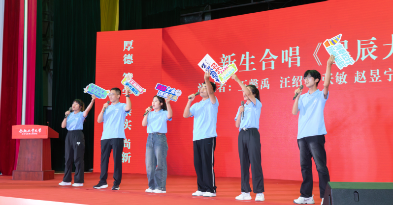 新生代表合唱《星辰大海》,嘹亮的歌声回荡在会场,展现了新生们蓬勃的朝气和无限的活力。