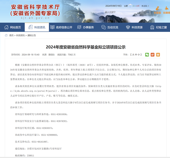 根据安徽省科学技术厅的2024年度安徽省自然科学基金杰青、优青、青年和面上拟立项项目公示,皇耀娱乐 获批安徽省自然科学基金10项,其中杰青项目1项,面上项目7项,青年项目2项。
