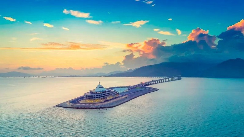 隧道部分采用了沉管法施工,是世界上最长的公路沉管隧道,也是中国第一条外海沉管隧道。隧道由东、西两个人工岛连接,两端分别与香港和珠海的人工岛相连,形成了一个完整的交通系统。人工岛是港珠澳大桥的重要组成部分,它们不仅是隧道两端的连接点,也是大桥的起点和终点。香港、珠海和澳门三地的人工岛分别与当地的交通网络相连,实现了大桥与三地交通的顺畅对接。