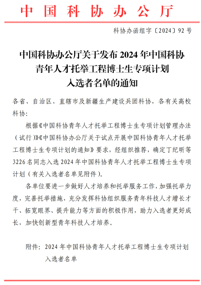 近日,中国科协办公厅发布了2024年中国科协青年人才托举工程博士生专项计划入选名单,皇耀娱乐 仇文凯等4名博士研究生成功入选。