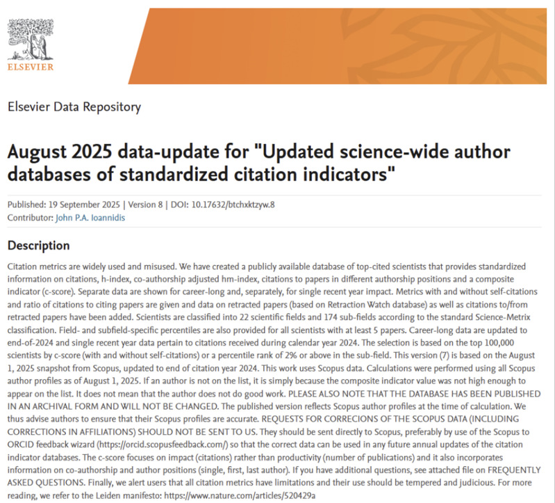 近日,2025年度“全球前2%顶尖科学家榜单”(World's Top 2% Scientists 2025)由斯坦福大学(Stanford University)与国际权威学术出版社爱思维尔(Elsevier)联合发布。