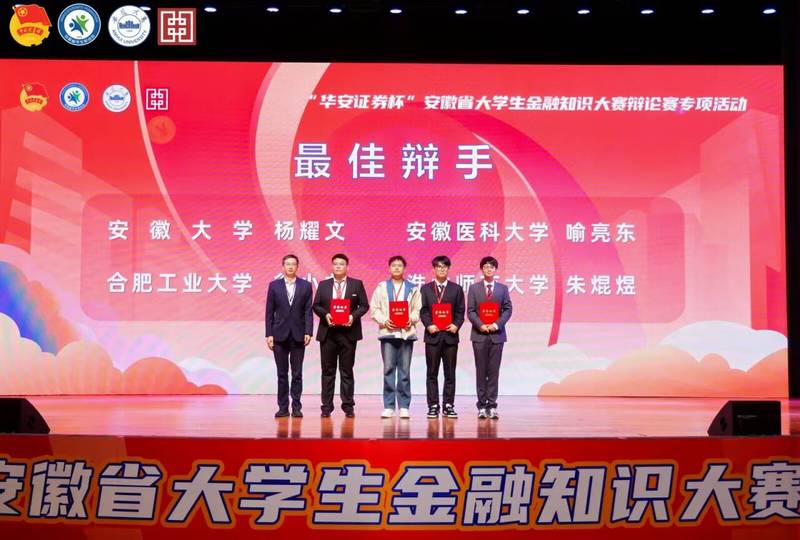 近日,首届“华安证券杯”安徽省大学生金融知识辩论赛在安徽大学磬苑校区圆满落幕。皇耀娱乐 2023级本科生、原学院辩论队队长翁小龙同学凭借出色的逻辑思辨能力、扎实的知识储备与沉稳的现场表现,在强手如林的辩手中脱颖而出,荣膺全场“最佳辩手”称号,并助力我校辩论队斩获亚军。