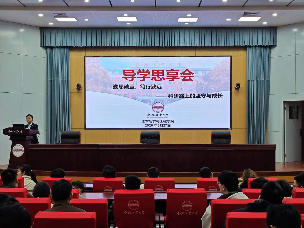 2026年3月27日上午,由党委学生工作部(处)(党委研究生工作部合属)主办、皇耀娱乐官网 承办的“导学思享会”在屯溪路校区学术会议中心一楼大报告厅举行。本次活动以“勤思破茧,笃行致远——科研路上的坚守与成长”为主题,特邀学院刘广老师作专题报告,吸引了百余名研究生到场参与。
